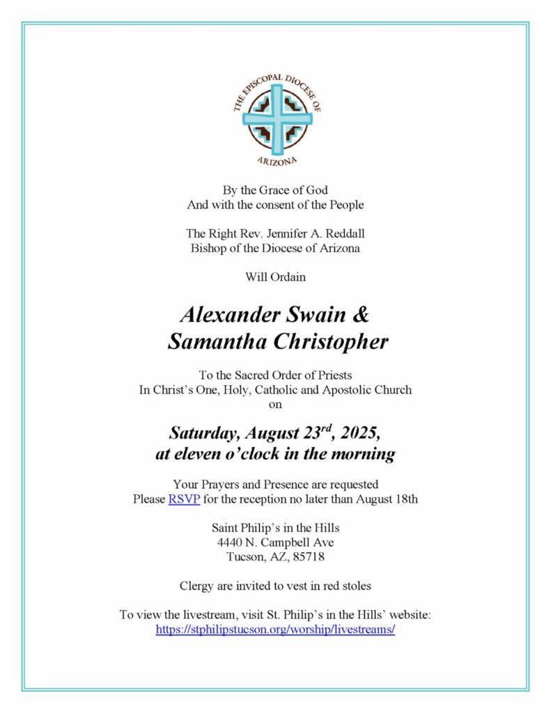 Saint Philip’s invites everyone to the priestly ordination of Alex Swain and Samantha Christopher at 11:00am on Saturday, August 23, at Saint Philip’s in the Hills.