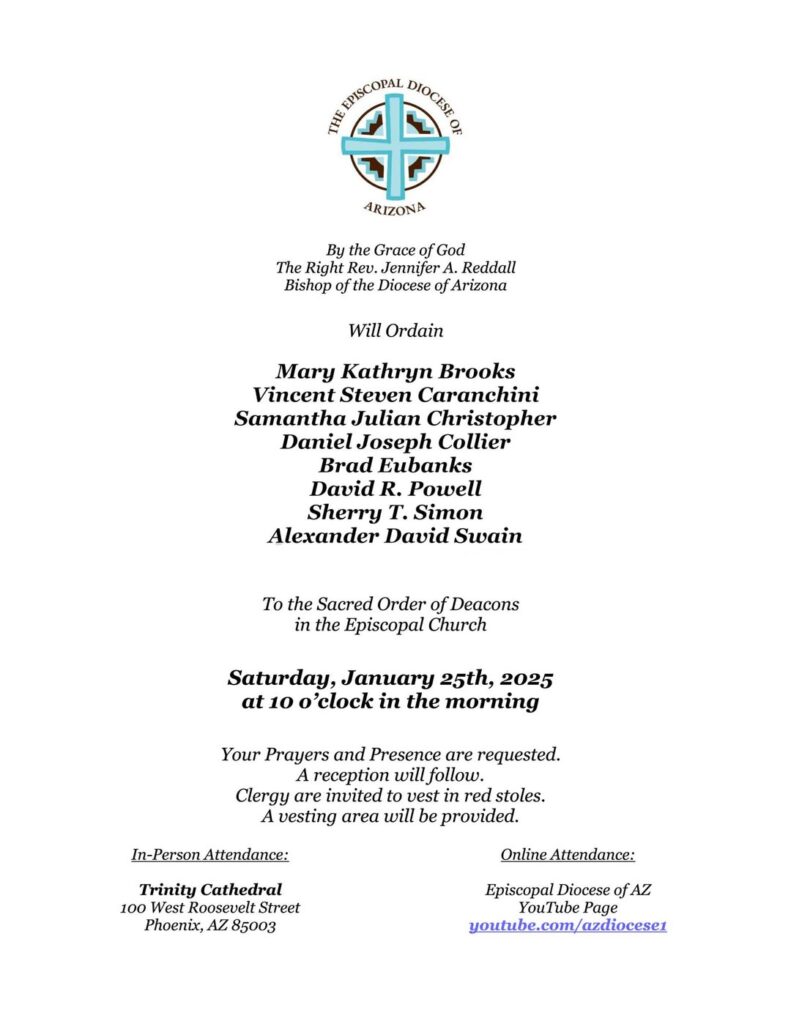 All are heartily invited to attend and celebrate this occasion with them at Trinity Cathedral in Phoenix. The service will also be live-streamed on the Episcopal Diocese of Arizona’s Youtube webpage.