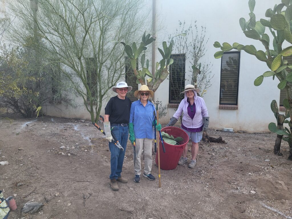 Volunteers began work last weekend on the land north of the Great Window. Their objective? To divert water from pooling against the north side of the sanctuary by creating a desert rain garden.