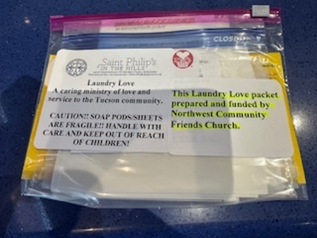 Laundry Love is deeply grateful for the unwavering support of Northwest Community Friends Church (Quakers) in Tucson. Volunteers want to especially recognize Siew Lilley who recently hand-delivered rolls of quarters and laundry packets with dryer sheets to parishioner Marilyn Lindell.