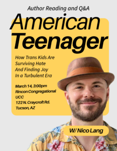 All are invited to an event hosted by journalist and author Nico Lang at 3:00pm, tomorrow, March 14 at Rincon UCC.