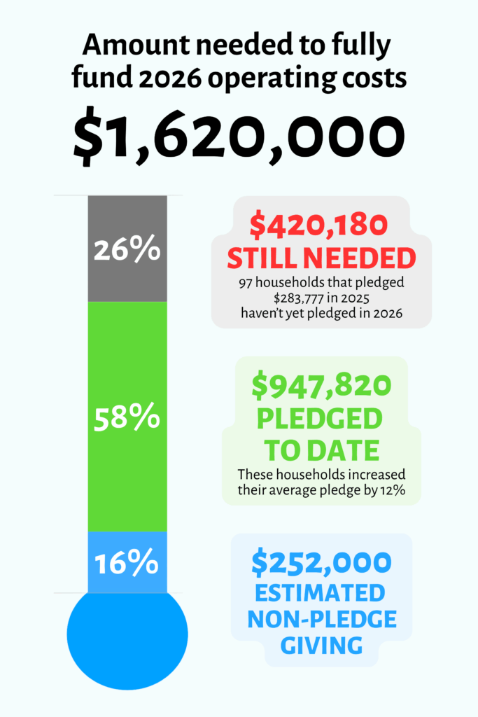 To date, there are 193 households who pledged in 2025 and have now pledged for 2026. To compare average pledges, the 2025 average pledge from these households was $4,087.00 and for 2026 the average pledge has increased to $4,572.00. We have also received 27 new pledges for 2026.
