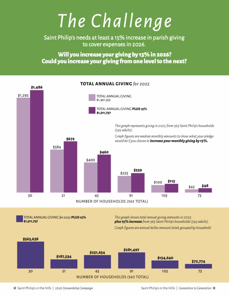 Currently, 96 households that pledged in 2025 have not yet pledged for 2026. As noted in our Stewardship brochure, Bonnie Winn (Stewardship Chair) and I indicated that we need a 15% increase in pledges to fully fund Saint Philip’s operating budget.