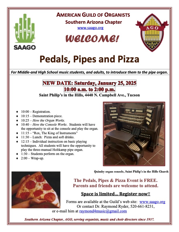 The Southern Arizona Chapter of the American Guild of Organists (SAAGO) will offer its annual Pedals, Pipes & Pizza event tomorrow, Saturday, January 25. This is the perfect opportunity to introduce students from middle school through high school to the King of Instruments: the magnificent pipe organ.