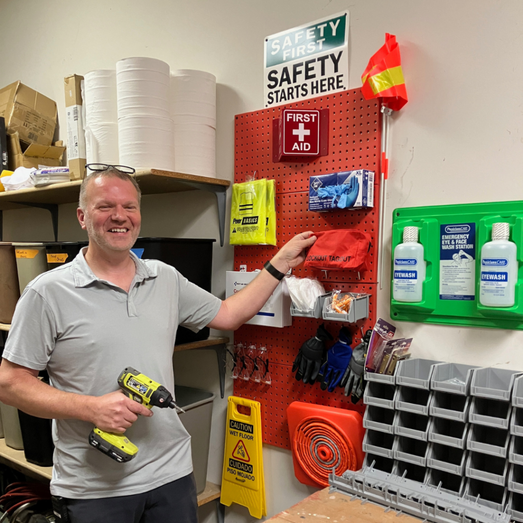 Facilities staff member, James Clarke, has prepared a safety corner for volunteers in the workshop. It includes an eye wash station, first aid kit, safety goggles, gloves, and electrical safety equipment.