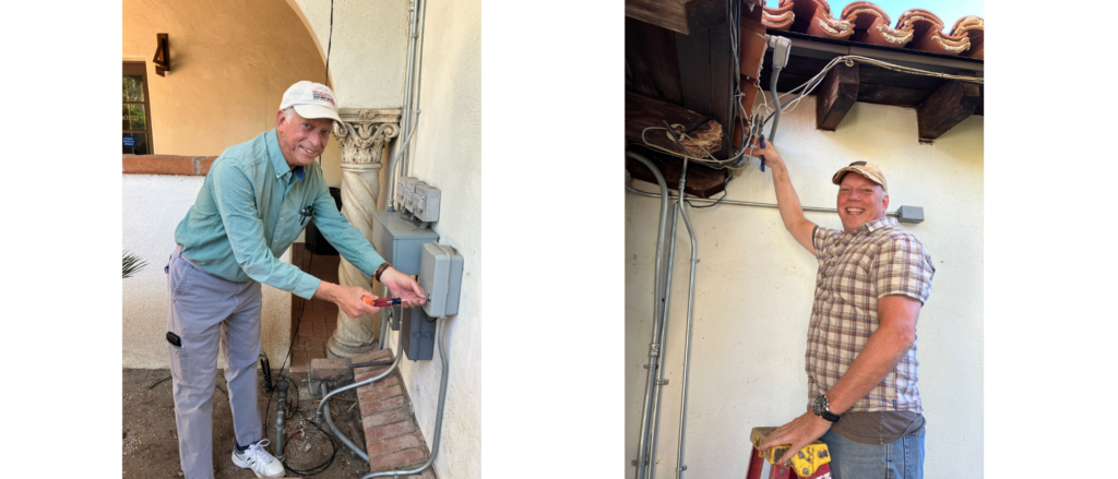Two parishioners, Terry Prince (left) and Chuck Perry (right), helped with electrical issues.