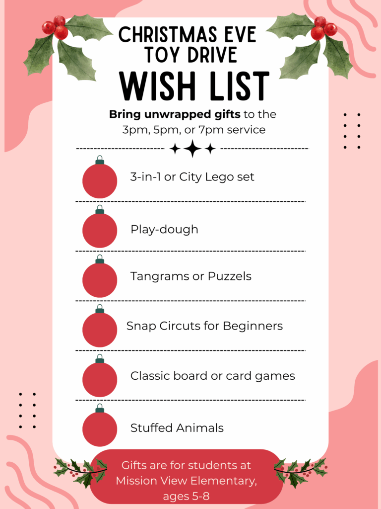 The gifts will be delivered to children who attend Mission View Elementary School—an organization with wonderful families who face very challenging circumstances. Suggested gifts are legos, superheroes, unicorns, and play-dough.